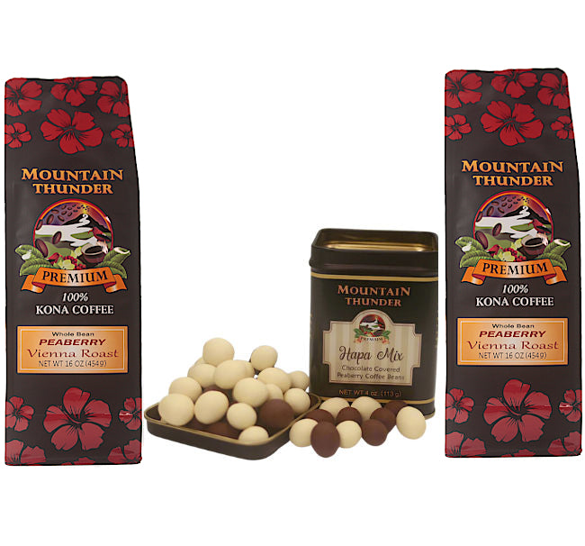This item includes Two 1 pound bags of our 100% Kona Peaberry Coffee and One FREE tin of our Hapa Mix Chocolate Covered Roasted Peaberry Coffee Beans.